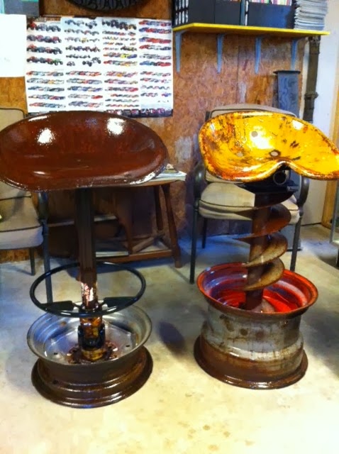 So Peck's Customs doesn't just work on cars, we also make custom stuff! A customer came to us a couple weeks ago wanting some bar stools made with old tractor seats and tire rims. She's picking up the first batch today and I think she'll be thrilled because they turned out awesome!